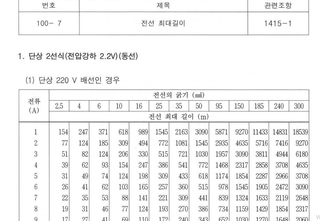 전선의 최대길이에 관한 표는 내선규정 부록 100-7에 수록되어있습니다.