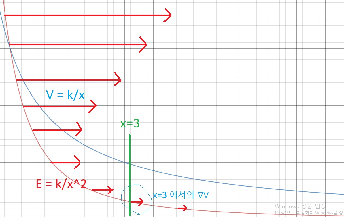 그러므로 ∇V 의 벡터함수는 E인데 전하를 전계의 방향과 반대로 움직일수록 전위가 쌓이니 전계와 전위의 방향은 반대가 됩니다